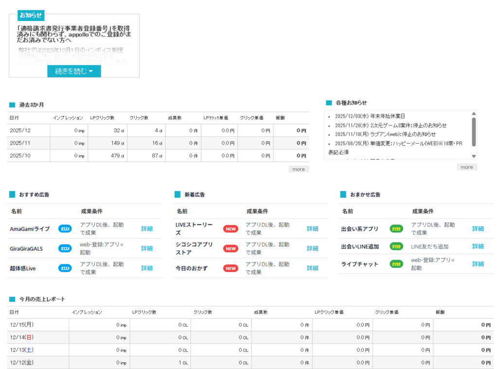 appolloログイン後、画面を下にスクロールしていただくと、新着広告、おすすめ広告、おまかせ広告をピックアップして表示しております。