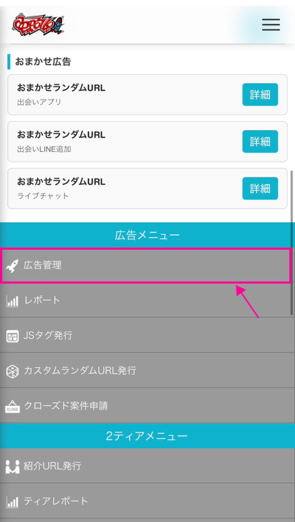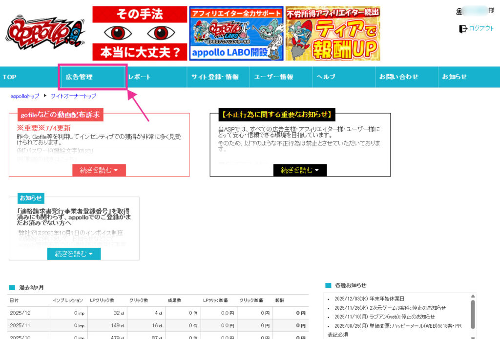 全ての広告が見たい方は、管理画面内の広告管理を押してください。
